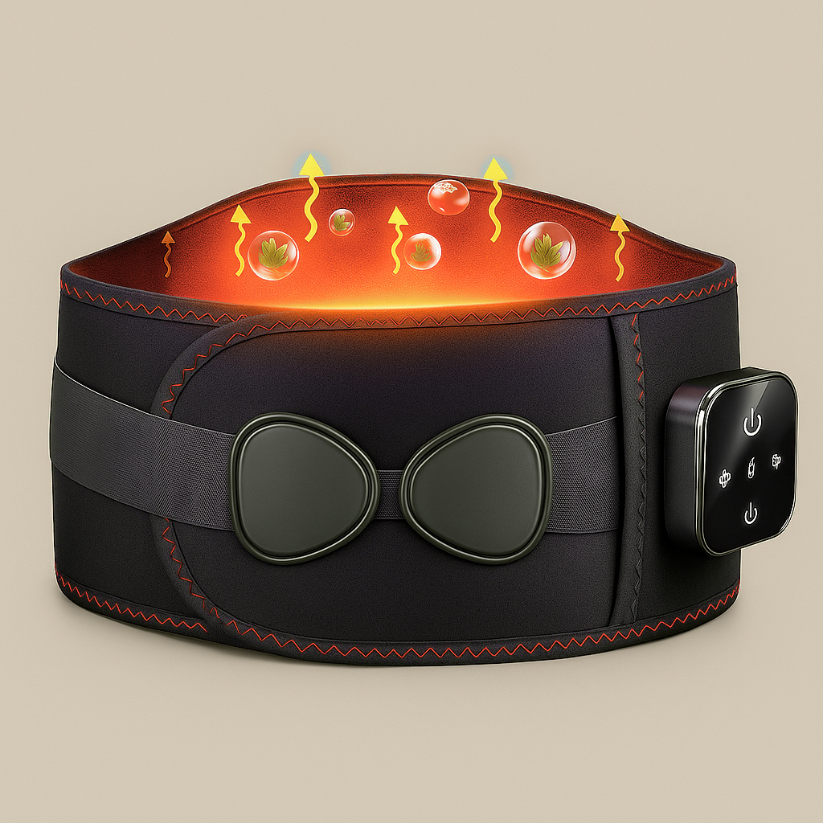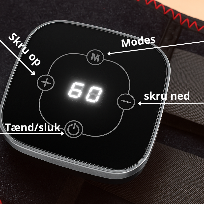 Varmebæltet bruger infrarød varme, der giver en jævn og behagelig varme. Du vælger selv temperatur (40°C–60°C) og mode direkte på controlleren, så du kan tilpasse varmen efter dit behov.